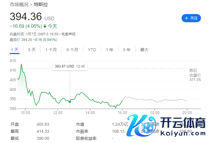财联社1月8日讯(剪辑 黄君芝)对特斯拉(Tesla)来说,周二是一个清贫的来回日。收尾周二好意思股收盘,该股跌4.06%,报394.36好意思元。