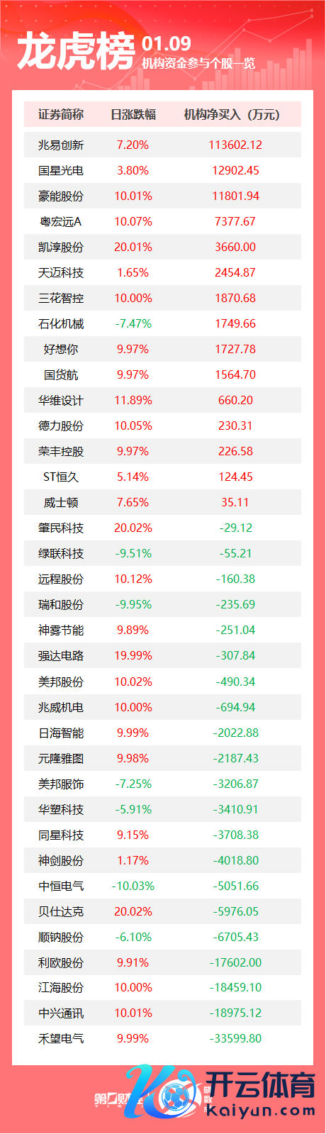 1月9日龙虎榜中,共36只个股出现了机构的身影,15只股票呈现机构净买入,21只股票呈现机构净卖出。当天机构净买入前三的股票差别是兆易立异、国星光电、豪能股份。当天机构净卖出前三的股票差别是禾望电气、中兴通信、江海股份。