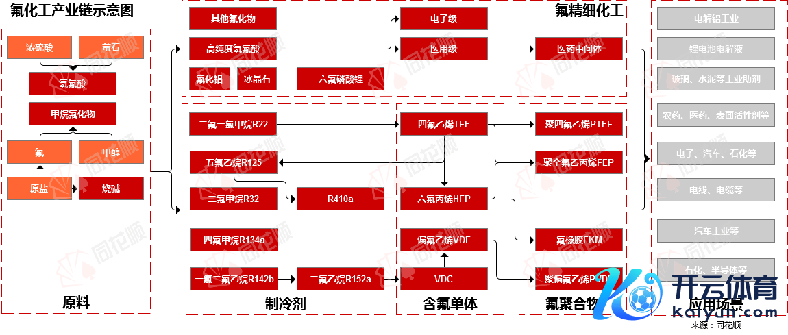 氟化工产业链以萤石为发轫,中上游主要为氢氟酸及氟化铝等,并蔓延出氟制冷剂、含氟团员物、含氟概括化学品和无机氟化物四大类,结尾居品为空调及汽车用的制冷剂、工业含氟新材料、半导体范畴中极其迫切的电子级氢氟酸等。氟化工产业链中,随居品加工深度加多,居品的附加值和利润率成几何级数增长。现在四代氟制冷剂、含氟概括化学品、含氟团员物等居品均处于起步及成长阶段。