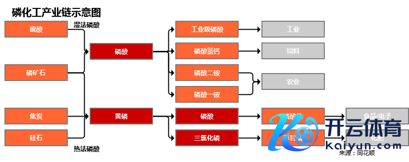 磷化工产业链,上游为原材料磷矿石,用硫酸、硝酸或盐酸剖析磷矿制得的磷酸统称为湿法磷酸;以黄磷为原料,经氧化,水化等反映而制取的磷酸称为热法磷酸。中游为含有磷元素的各有机物、无机物,卑劣为制成的家具,诈欺于农业、工业等各样行业。